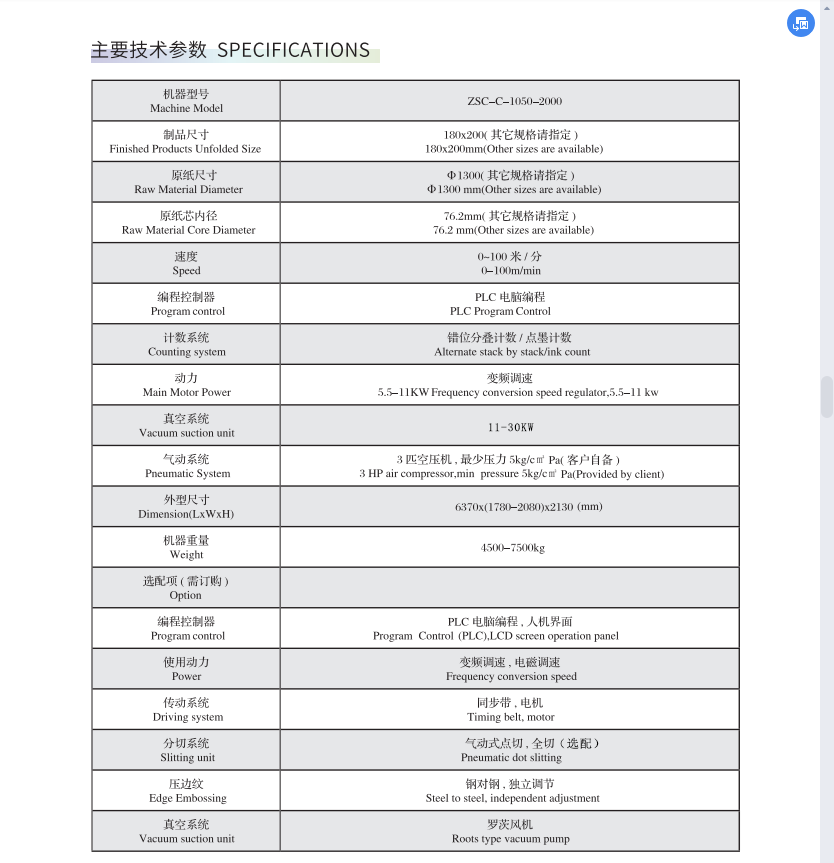 ZSC-C型麵巾紙機采用(yòng)PIC電腦編(biān)程技術,變頻調速,及配置有觸摸式人機界麵操作係統,自(zì)主研(yán)發了遠程通訊服務係統,可隨時監控機械的運作情況;整機來用獨立傳動,設備適(shì)合多種原紙的需要,極大地提高(gāo)了品質和效率。 主要特點 1、配置(zhì)氣動(dòng)式(shì)鋼(gāng)對鋼壓花,氣動式分離; 2、退(tuì)紙架采用氣動上紙(zhǐ)、無級調(diào)節速比,調整不同紙質張力; 3、采用羅茨真空泵吸附(fù)係統,吸氣量大,運行(háng)穩定; 4、可根據需要折疊不(bú)同寬度的成品,可選用點切或全切; 5、配(pèi)置鋼對鋼壓(yā)紋裝置,確保(bǎo)雙(shuāng)層麵巾紙不分層; 6、可根據需(xū)要(yào)配(pèi)置(zhì)原紙對齊功能; 7、斷紙(zhǐ)自(zì)動停(tíng)機係(xì)統,避免無紙或斷紙產(chǎn)生廢品; 8、采用前後點動開關牽引(yǐn)原紙,操作更簡(jiǎn)便、更安全;